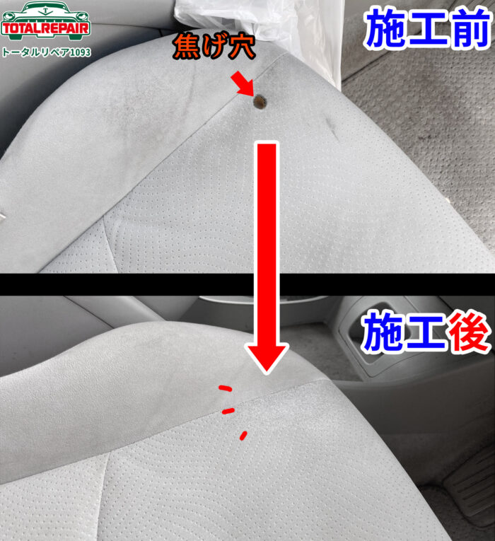 シートのタバコの焦げ穴を補修しました。 仕上がりは上写真のとおりです。 模様の再現はできないのですが、穴は埋まり、目立たなくなりました。 依頼主様にも「十分です」とご納得いただけました。 ご依頼ありがとうございました。