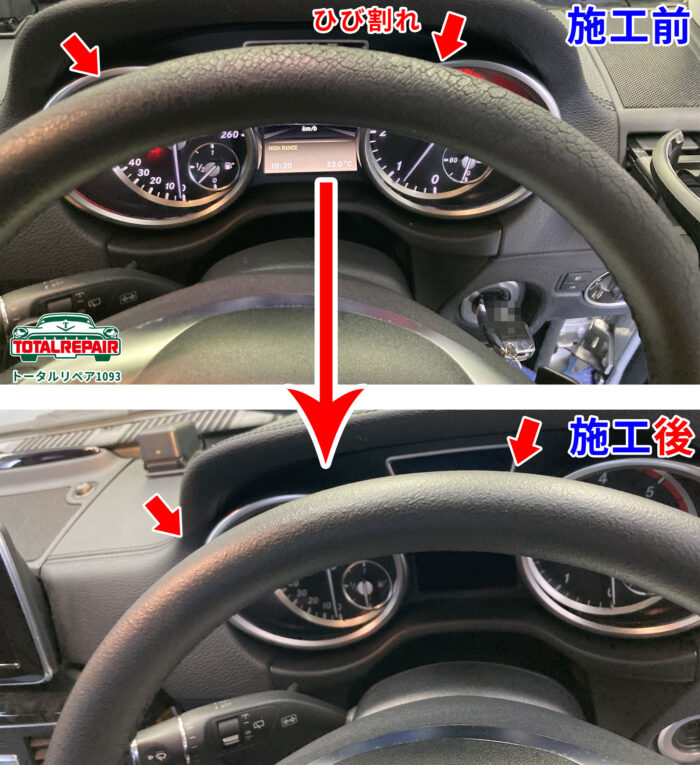経年劣化で表皮がひび割れてしまったステアリングを補修しました。 広範囲にわたり、ひび割れしており、補修作業に時間がかかりました。 仕上がりは上写真の通りです。 依頼主様にもご納得いただけました。 ご依頼ありがとうございました。